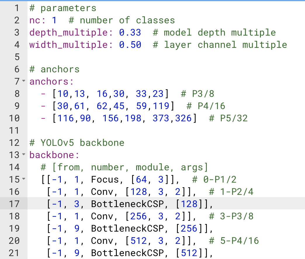 yolov5/models 에 여러 파일들이 있다. 그 중 하나 선택하여 해당 파일 내용중 nc 를 자신이 학습시키고자 하는 클래스 개수로 바꾼다.