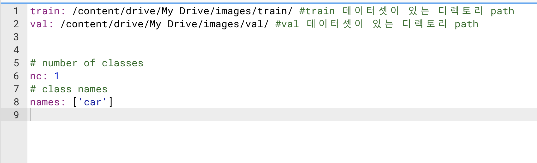 data.yaml : 모델 학습을 위한 작은 튜토리얼 같은 것 (내 드라이브/dataset 아래에 만들어준다)