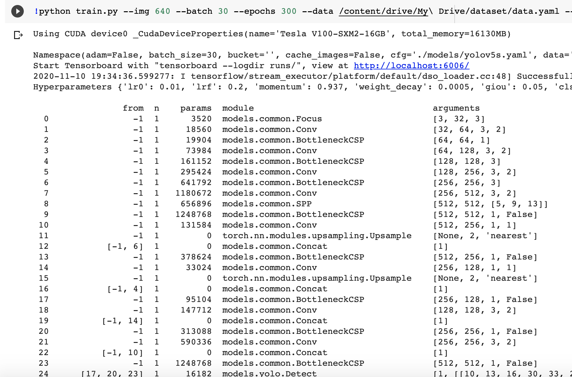 !python train.py --img 640 --batch 30 --epochs 100 --data /content/drive/My\ Drive/dataset/data.yaml --cfg ./models/yolov5s.yaml --weights yolov5s.pt --name [내가 정한 폴더명]