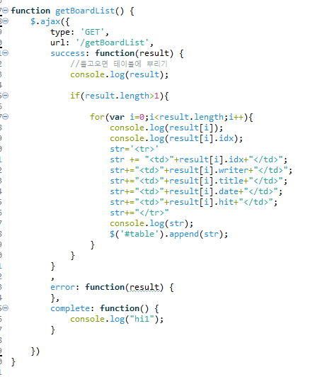 처음에는 success 에 데이터가 제대로 받아지는 지 확인부터 하기 위해 console.log(result)만 넣어놨었다.