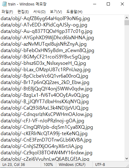 build\darknet\x64\data\ 아래에 train.txt 파일을 만들고 모든 이미지의 경로를 적는다. (darknet.exe 기준 상대경로로)