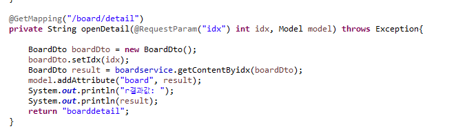 상세 페이지는 detail.html이고 idx를 파라미터로 받아서 idx에 해당하는 content를 불러와서 view에 board 객체로 전달해준다.