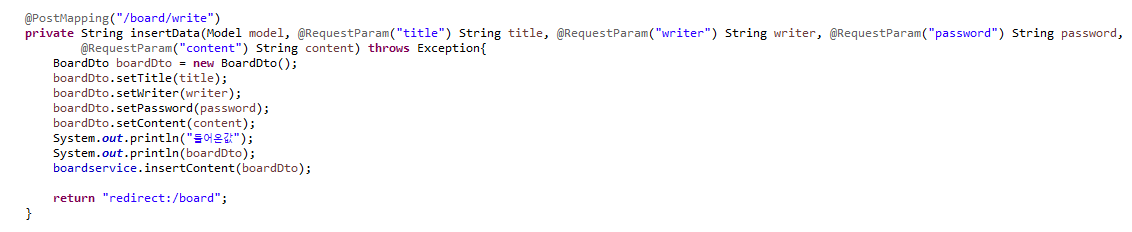 form에서 받아온 데이터는 제목, 작성자, 비밀번호, 내용이다. 이것들을 모두 dto에 저장하고 service단으로 넘겨준다. 그리고 페이지는 원래 글목록 페이지를 보여줘야하기 때문에 "redirect:/board"를 return 해준다.