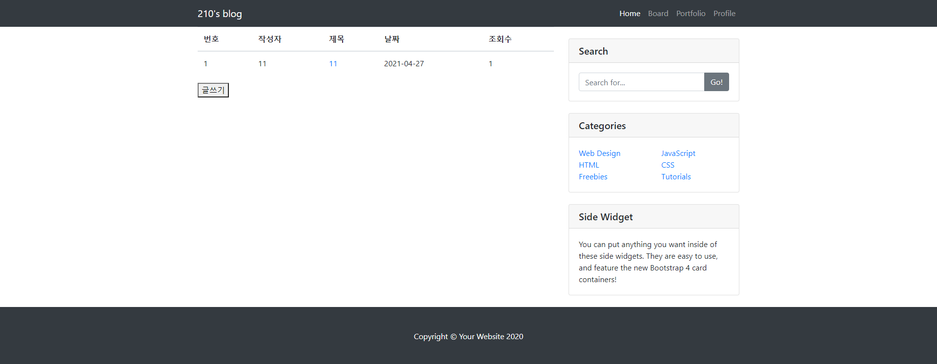 버튼을 누르자 원래 글목록 페이지로 돌아왔고, 내가 작성한 글이 목록에 뜨는것을 알 수 있다.