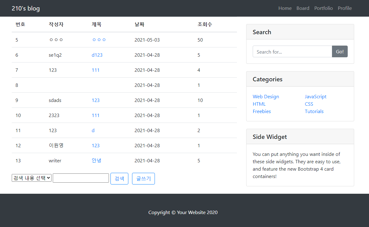 선택 옵션으로 (제목, 내용, 작성자)를 넣고 옆에는 키워드를 입력할 수 있는 input창을 만들었다. 검색 버튼도 만들었다.